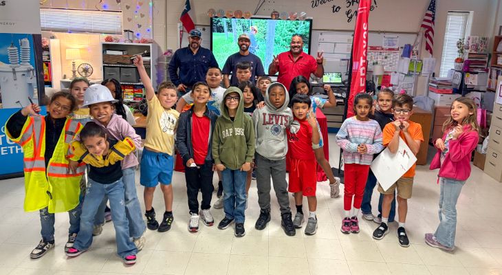 A team of AEP Texas employees visited Ella Barnes Elementary in Corpus Christi to teach electrical safety and introduce students to career pathways in the utility industry. Staff demonstrated how electricity works, showcased trucks, climbing gear, and personal protective equipment, and let students try on hard hats and vests to make the experience hands-on and memorable.